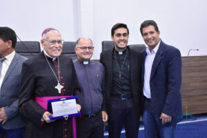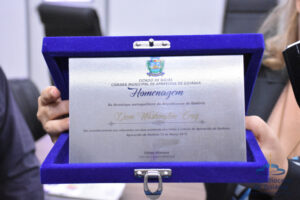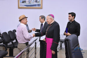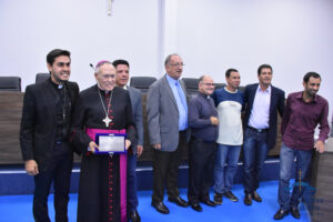 Ao final da audiência, o presidente da Câmara e os demais vereadores entregaram uma placa de agradecimento e homenagem a Dom Washington.