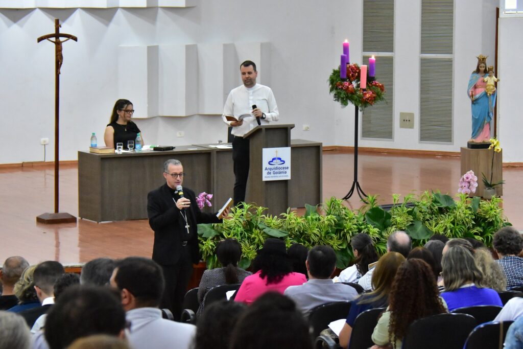 Em seguida, o padre Maximiliano Costa, vigário episcopal para a Evangelização, apresentou a estrutura do documento, que visa ser instrumento de unidade, organização e fortalecimento da catequese, em sintonia com as orientações da Igreja no Brasil e com o caminho sinodal vivido pela Arquidiocese. Daniela Araújo, assessora do Setor de Iniciação à Vida Cristã na Arquidiocese de Goiânia, apresentou as metodologias dos encontros propostos para cada etapa do caminho catecumenal. Durante as explanações o arcebispo de Goiânia, Dom João Justino, afirmou seus anseios e destacou a importância do documento para a vida pastoral da Arquidiocese de Goiânia, além de fazer pontuações para aprimorar a compreensão dos presentes em suas respectivas realidades paroquiais.