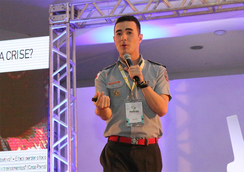 O tenente do Corpo de Bombeiros Militar de Minas Gerais (CBMMG) Pedro Aihara, especialista em prevenção de desastres e porta-voz da corporação, fechou o dia de palestras, nesta sexta-feira (19), no 11º Mutirão Brasileiro de Comunicação (Muticom 2019), que começou ontem (18) e segue domingo (21) na Cidade da Comunhão – Centro Pastoral Dom Fernando (CPDF), em Goiânia.