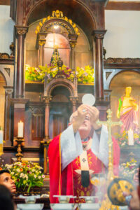 A caminhada culminou na Missa da Vigília de Pentecostes, presidida por Dom João Justino de Medeiros Silva, Arcebispo Metropolitano, e concelebrada por Pe. Rubens Sodré Miranda — que acompanha pastoralmente as novas comunidades —, por Pe. Fernando César e por Pe. Roberto. A igreja estava completamente cheia, assim como o espaço externo, um sinal claro do anseio por espiritualidade e esperança de todo o povo de Deus.