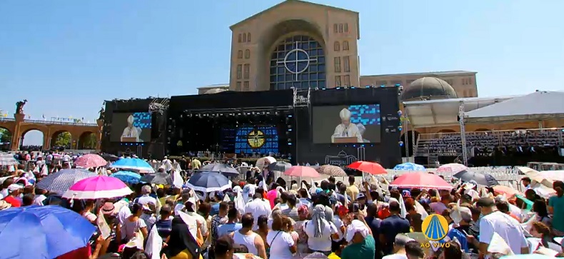 Em 2013, na ocasião de minha primeira viagem apostólica internacional, tive a alegria e a graça de estar no Santuário de Aparecida e rezar aos pés de Nossa Senhora, confiando-lhe o meu pontificado e lembrando o povo brasileiro com a acolhida tão calorosa, que vem do seu abraço e coração generoso. Naquela ocasião, inclusive, manifestei meu desejo de estar com vocês no ano jubilar; mas a vida de um Papa não é fácil. Por isso, quis nomear o Cardeal Giovanni Battista Re como Delegado Pontifício para as celebrações do dia 12 de outubro. Confiei a ele a missão de garantir assim a presença do Papa entre vocês!