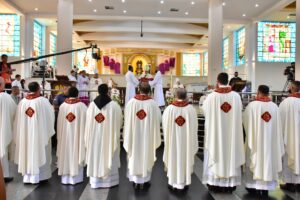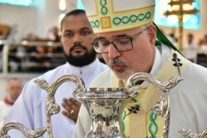 Aconteceu na manhã desta Quinta-Feira Santa, 2 de abril, no Santuário-Basílica do Divino Pai Eterno, em Trindade, a Missa do Crisma. A celebração foi presidida por Dom João Justino, arcebispo de Goiânia, e contou com a presença dos bispos auxiliares Dom Levi Bonatto, Dom José Roberto dos Reis, CP; de religiosos e religiosas, diáconos permanentes e transitórios; do clero arquidiocesano e de todo o povo de Deus.