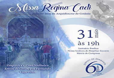 O arcebispo Dom Washington Cruz convida a todos para a grande celebração pelos 60 anos de criação da Arquidiocese de Goiânia, dia 31 de maio, às 19h, no Santuário Basílica de Nossa Senhora do Perpétuo Socorro (Matriz de Campinas). A "Missa Regina Caeli" trará composições de Fernando Cupertino, interpretadas pela Orquestra e pelo Coro Sinfônico Jovem de Goiás.