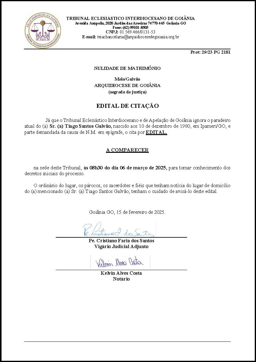 O Tribunal Eclesiástico Interdiocesano e de Apelação de Goiânia informa: