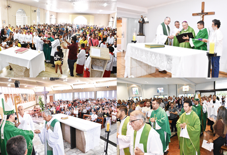 O povo de Deus, em quatro paróquias da Arquidiocese de Goiânia, acolheu seus novos administradores e vigários paroquiais, no domingo, 14 de dezembro. As celebrações aconteceram em Goiânia e em Senador Canedo e foram presididas pelo arcebispo Dom Washington Cruz, e pelo bispo auxiliar Dom Moacir Silva Arantes. Foram momentos de graça para essas comunidades que começam uma nova etapa em sua caminhada pastoral. Como bem disse Dom Washington, em uma das posses, os novos administradores “têm a missão de receber o Evangelho de Cristo, ensinar aquilo que creem e procurar realizar o que ensinam”.